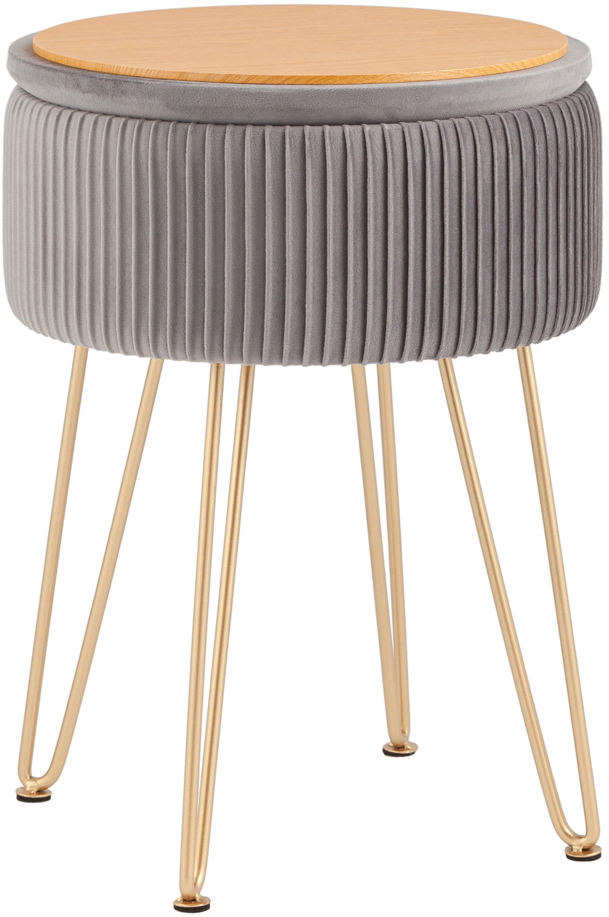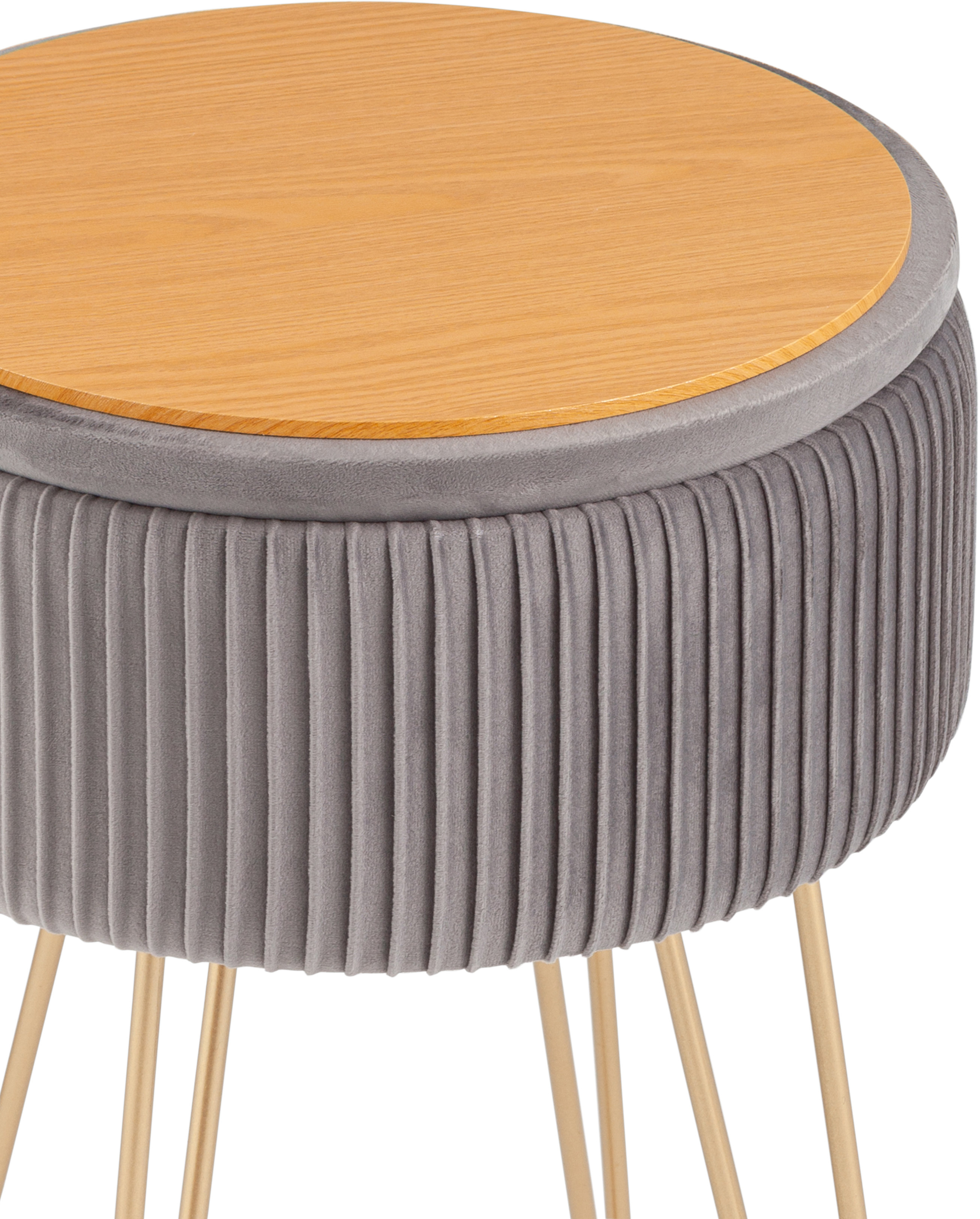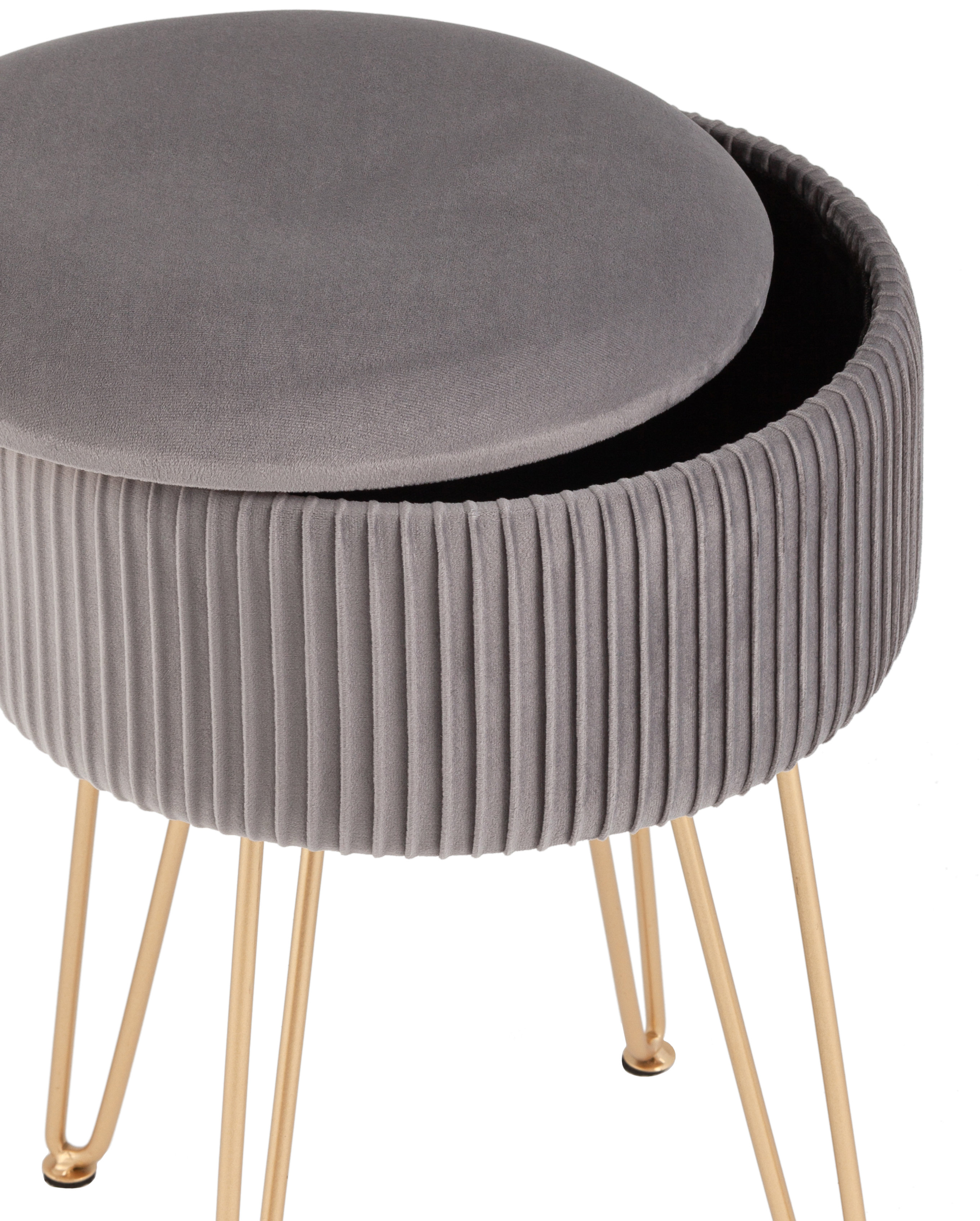 Лаконичный круглый пуф на металлических ножках с ящиком для хранения. Мягкая обивка выполнена из износостойкого велюра, тактильно приятный и долговечный материал. Под сидением имеется ящик для хранения мелочей, крышка полностью съемная. Он не только удобный, но и функциональный. Благодаря двухсторонней крышке, пуф можно трансформировать в журнальный столик.