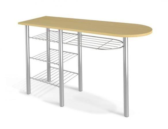 Это не просто обеденный стол, это стол, который соединяет в себе место для приема пищи и барную стойку. Модель лаконичная, компактная, идеально впишется в интерьер любого кухонного помещения. Изготовлена барная стойка из дерева, которая обладает долговечностью и высокой прочностью. Деревянная столешница установлена на металлический каркас, выдерживающий большие нагрузки. Все элементы стола защищены от воздействия насекомых и грибка, и не нуждаются в особом использовании. Столешница стола выполнена из ламинированного ДСП, которая обладает высокой устойчивостью к внешним повреждениям. Максимальная нагрузка не должна превышать 50 кг. Также модель дополнена полками для хранения продуктов, кухонных принадлежностей, посуды и прочего.