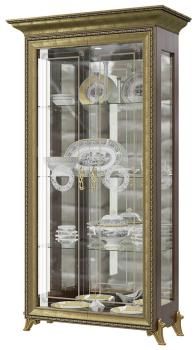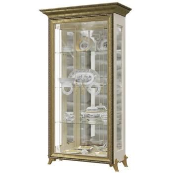 Очаровательный шкаф Версаль, выполненный в роскошном дворцовом стиле, внесёт в интерьер винтажные нотки шикарной старины. Аристократичный шкаф, сияющий золотой отделкой и фейерверком стекла – изысканная горка для Вашей фамильной посуды и хрусталя. Шкаф со стеклянными дверками, боковыми вставками и 3 полками, в обрамлении богатой рамки фасада, выглядит воздушным и сказочно красивым. Эффектное отражение посуды в зеркальных задних стеночках шкафа внесёт в оформление гостиной яркие цветовые акценты и сияние света. Светильнички, встроенные над верхней полкой шкафа, добавляя игристые отблески от зеркал, станут креативным источником освещения в гостиной. Стекла распашных дверок шкафа украшены фацетом, тонким витиеватым орнаментом и шикарной пескоструйной розеткой.