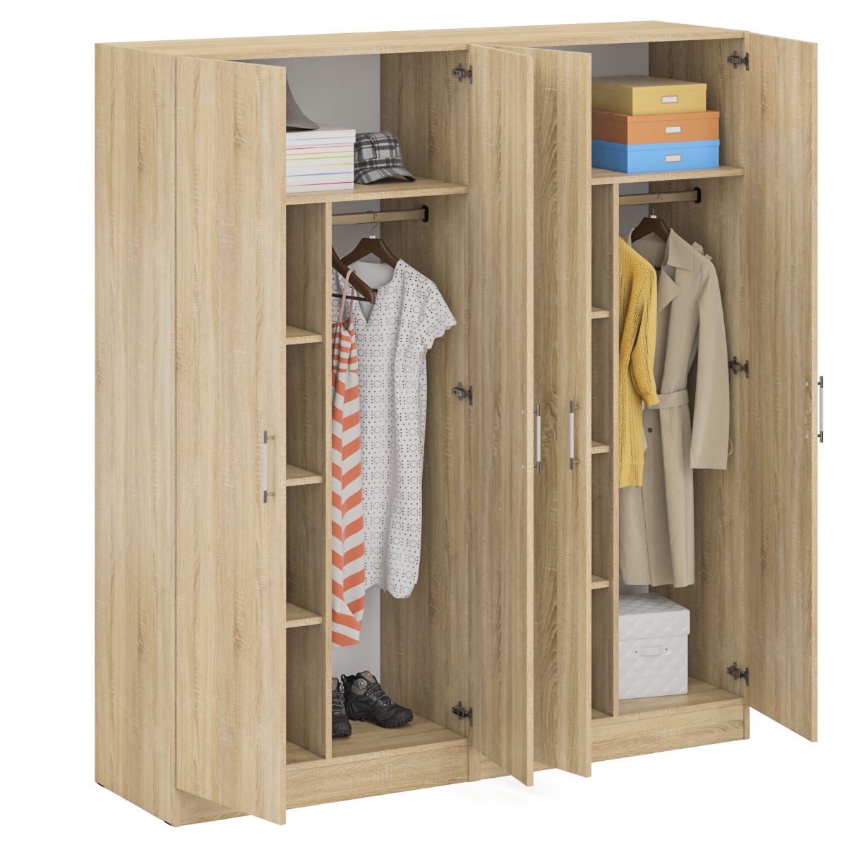 Два 2-х створчатых шкафа для одежды Стандарт. Габариты (ШхГхВ) 180х52х200 см. Состоит из 2-ух створчатых шкафов. За распашными дверками каждого шкафа расположены отделение со штангой для одежды на плечиках и антресольной полкой с одной стороны, и нишей с тремя полками с другой.