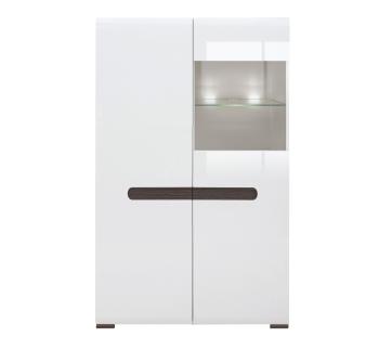 Большой двухстворчатый шкаф красив и практичен. Правая дверца — с прочным закаленным стеклом — отражает такую же стеклянную полку с закрепленной на ней невесомой LED-подсветкой. Над ней находится узкая глубокая ниша. Внизу этой части шкафа — две довольно вместительные ячейки, образованные съемной полкой из ДСП.