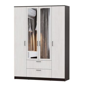 Для организации продуманного хранения в спальне прекрасно подойдет вместительный четырехдверный шкаф Виста. Центральная часть модуля имеет две распашные дверцы с зеркалами, за которыми скрывается стационарная штанга, и два выдвижных ящика на усиленных роликовых направляющих. Боковые секции модуля оснащены комплектом их 4-х полок каждая. Благодаря универсальному декору с древесным рисунком шкаф буде гармонично дополнять любой современный интерьер.