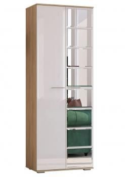 “Вместительный двухстворчатый шкаф содержит платяное отделение и удобные полки для одежды. Одна из створок декорирована плиткой из зеркал с фацет-обработкой.