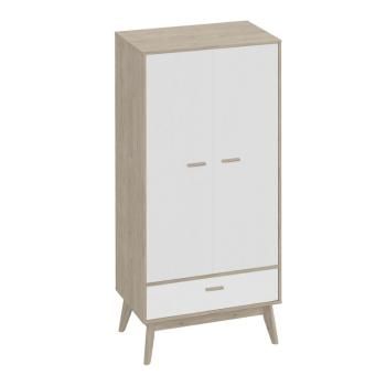 Внутри шкафа есть штанга для одежды и две глубоких полки, расположенных с правой стороны. В нижней части шкафа есть широкий вместительный выдвижной ящик на шариковых направляющих, который выдвигается легко и бесшумно. Корпус изделия выполнен из ЛДСП цвета натурального дуба. Фасады – из белого матового МДФ. Изюминка дизайна — высокие стильные ножки из массива березы, расположенные под углом. Они придают изделию очаровательную винтажную нотку, отсылая к мебельной моде 60-х-70-х годов.