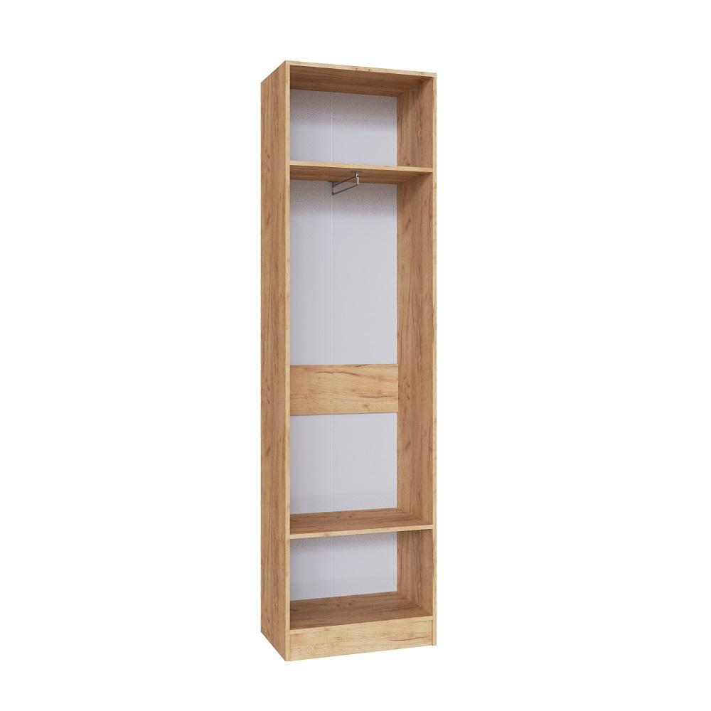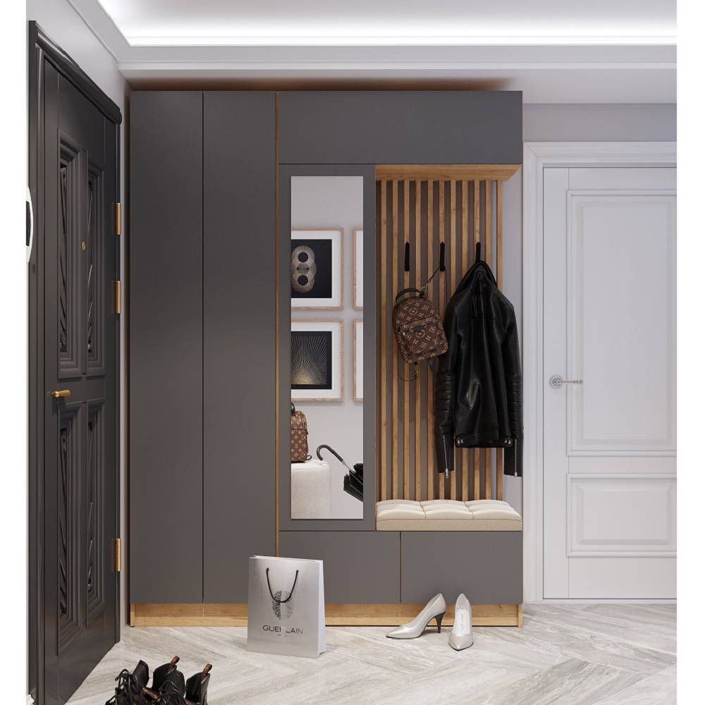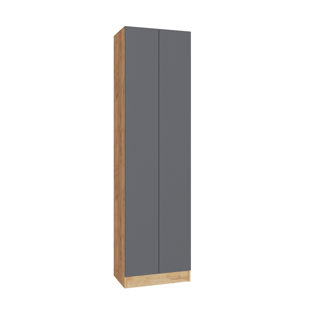 Корпус шкафа выполнен из ЛДСП в декоре “дуб крафт золотой”, что придает ему теплый и современный вид. Фасад из ЛДСП в графитово-сером цвете добавляет изысканности и контраста. Отсутствие лицевой фурнитуры создает минималистичный и чистый дизайн, который легко вписывается в любой интерьер.