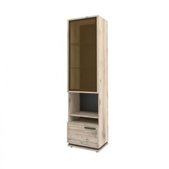 Высокий шкаф для посуды удобен своей функциональностью и эргономичностью конструкции. За тонированным стеклянным фасадом – 2 регулируемые по высоте бесцветные стеклянные полки. Витрина открывается за боковой свес. На открытой полке разместите фотографии или элементы декора, а за глухим откидным фасадом спрячьте документы и ценные вещи от посторонних глаз. Регулируемые опоры шкафа позволят компенсировать незначительные неровности пола.