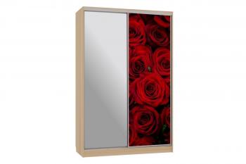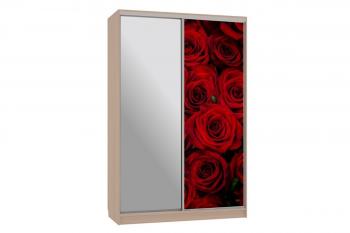 - Современные двери-купе: рамочный стальной профиль с одной зеркальной и одной стеклянной створкой с принтом