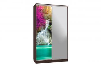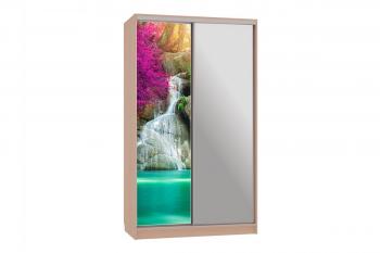 - Стильные двери-купе – выполнены с рамочным стальным профилем. Одна дверь оснащена зеркалом, вторая – стеклом с принтом и противоосколочной пленкой, что делает шкаф не только функциональным, но и эстетически привлекательным.