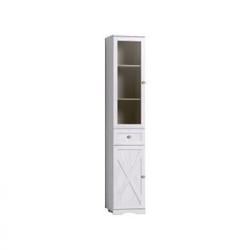 Высокий шкаф для хранения идеально подходит для детской комнаты, в которой скапливается множество разнообразных и таких нужных вещей. В верхний застекленный фасад можно убрать книги, настольные игры, фотографии и любимые игрушки. В выдвижном ящике на шариковых направляющих легко хранить разные мелочи и аксессуары. Нижний глухой фасад, декорированный Х-образной раскладкой из профиля МДФ, скрывает нишу с полочкой, регулируемой по высоте. Верхний и нижний фасады можно перевесить на левую и на правую стороны. Шкаф обязательно крепится к стене за подвесы и межсекционной стяжкой с другими шкафами в наборе.