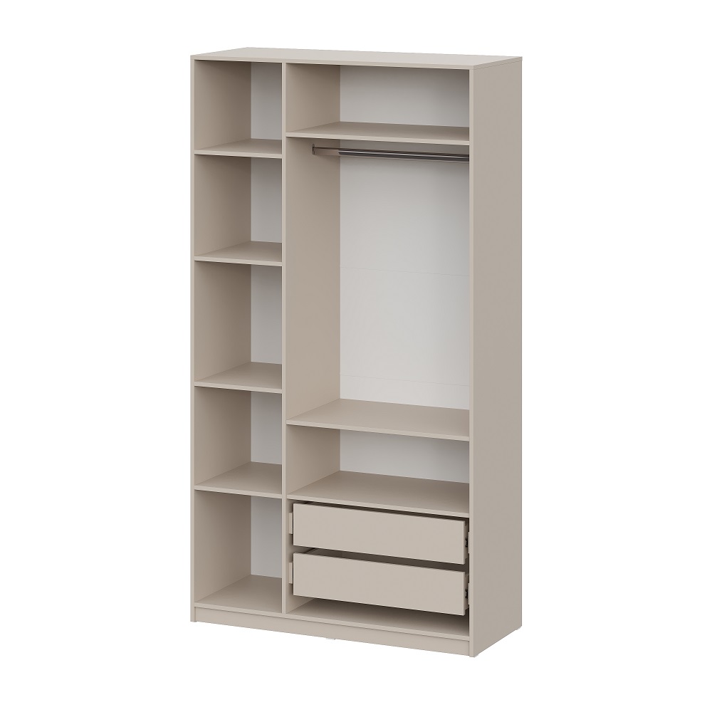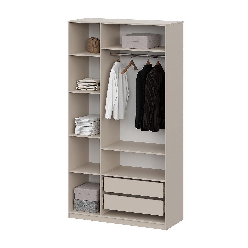 Данный шкаф оборудован просторными полками, ящиками и штангой для вешалок, что делает его идеальным для хранения одежды и аксессуаров. В комплект входят: 7 полок, 2 ящика и 1 штанга для вешалок, что обеспечивает максимальную организацию пространства.