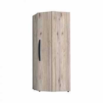 Отлично организовать пространство в маленькой спальне поможет угловой шкаф. Гладкие фасады и натуральный декор шкафа привнесут в комнату особый уют и теплоту. Стационарная штанга и полноценный стеллаж для белья внутри способствуют аккуратной организации вещей. Шкаф обязательно крепится к стене на подвесы, а компенсировать неровности пола можно, благодаря регулируемым опорам.
