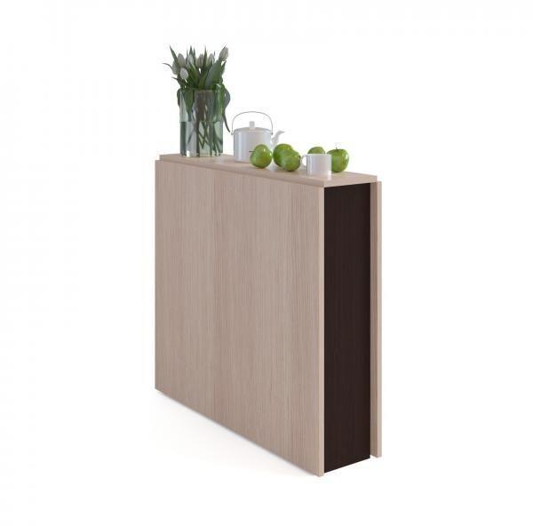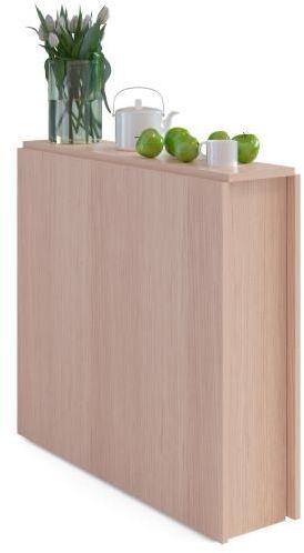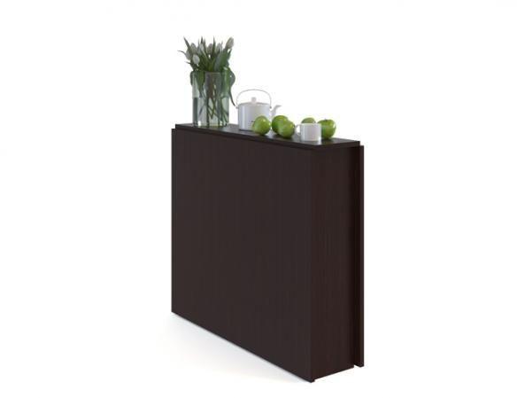 В разложенном состоянии размеры столешницы составляют 1600 х 800 мм. За столом можно с комфортом разместить шестерых гостей. Чтобы разложить стол-книжку, нужно поднять крылья столешницы и вкрутить ножки в специальные опорные площадки. В сложенном виде ножки хранятся в нише по центру стола. Изготавливается из ЛДСП толщиной 16 мм, края обработаны кромкой ПВХ 0,4 мм.