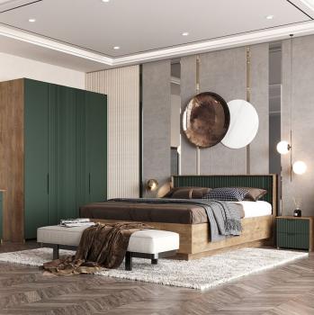 Спальня «Герта» КМК 0979 — это идеальный выбор для вашего дома. Если вы хотите купить спальню «Герта» в Москве, это сделать очень просто! Кровать с подъемным механизмом и ящиком для белья имеет размеры 160×200 см, что обеспечивает комфортный отдых. Каркас выполнен из качественного ЛДСП цвета дуб канзас, а изголовье изготовлено из МДФ в зеленом матовом оттенке.
