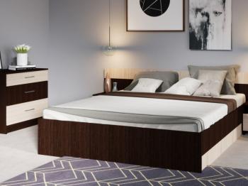 В комплект входят: комод с ящиками, кровать с крепким и надежным основанием из ламинированной плиты и прикроватные тумбы.