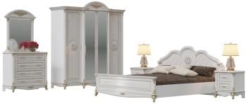Спальня состоит из кровати 1800 с двумя прикроватными тумбочками, шкафа 4-х дверного и комода с зеркалом.