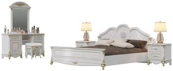 В данной комплектации гарнитур состоит из кровати 1800 с двумя прикроватными тумбочками, стола туалетного с зеркалом и пуфом.