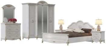 В данной комплектации гарнитур спальный состоит из кровати 1600 с двумя прикроватными тумбочками, шкафа 4-х дверного и комода с зеркалом. Практичность удобной, прочной кровати с большим спальным местом, размером 1600х2000 мм, безусловно радует, а волшебная красота очаровывает! Ортопедическое основание входит в комплект поставки, матрас приобретается отдельно.