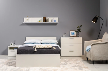 В состав комплекта входят: комод Эйр 16.242, полка Эйр 16.490, кровать Эйр 11.46.01 и две тумбы прикроватные Эйр 16.12. Все элементы выполнены из прочного материала, оснащены металлическими ручками, пластиковыми опорами и защитными демпферами.
