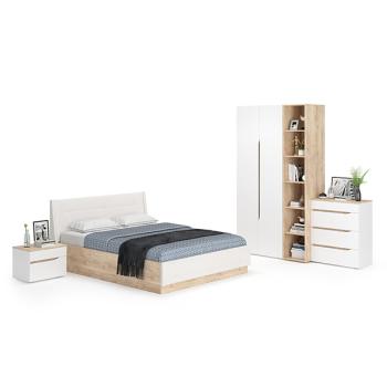 Каждый элемент гарнитура продуман до мелочей. Двухстворчатый шкаф с открытым стеллажом удобен для хранения одежды, комод с 4 ящиками поможет организовать пространство, а прикроватные тумбы с двумя ящиками каждая – всегда под рукой для мелочей.