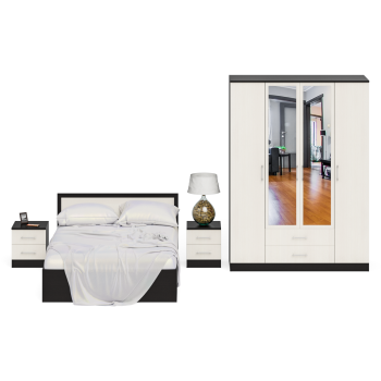 Гарнитур спальный Фиеста № 3. Цвет – венге/дуб лоредо. Комплектация – кровать 1400 с двумя тумбами прикроватными и шкаф 4-х створчатый. Спальное место 1400х2000 мм. Основание под матрас в комплекте, матрас приобретается отдельно. Современный выбор – жить комфортно, тратить рационально! Универсальная сборка.