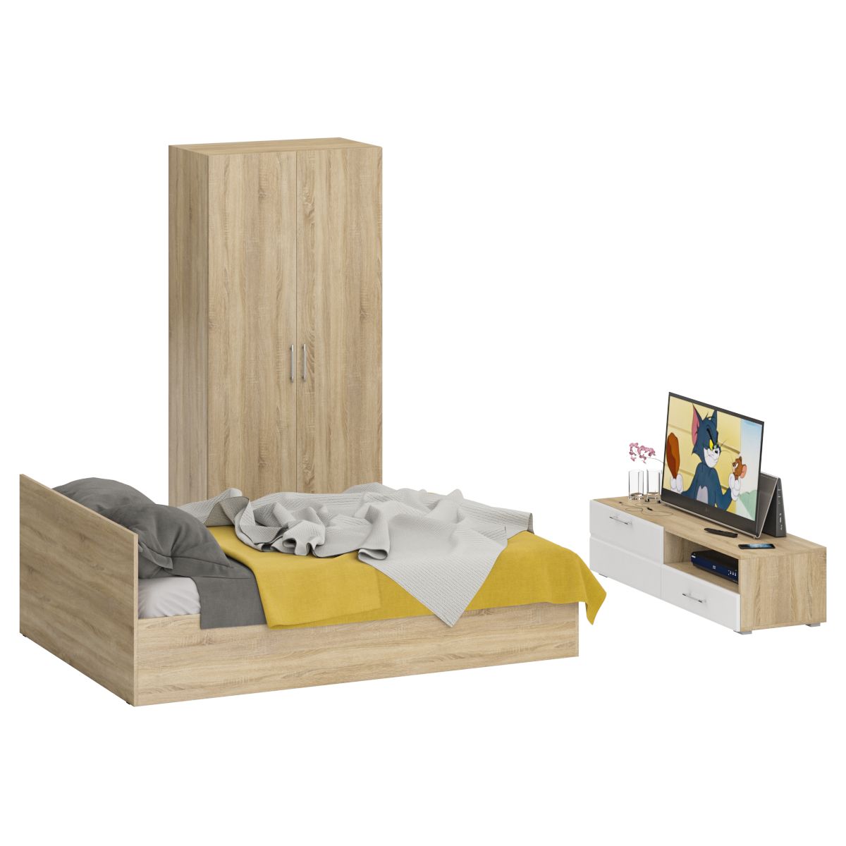 Спальня Стандарт № 3 с кроватью 1400. Сп.м. 1400х2000 мм, основание в комплекте (настил ДСП), матрас приобретается отдельно. За распашными дверками шкафа для одежды расположены отделение со штангой и антресольной полкой с одной стороны, и нишей с тремя полками с другой. Тумба под ТВ разделена на два одинаковой ширины отделения. Слева расположена закрытая откидной дверкой ниша, справа – открытая ниша и выдвижной ящик.