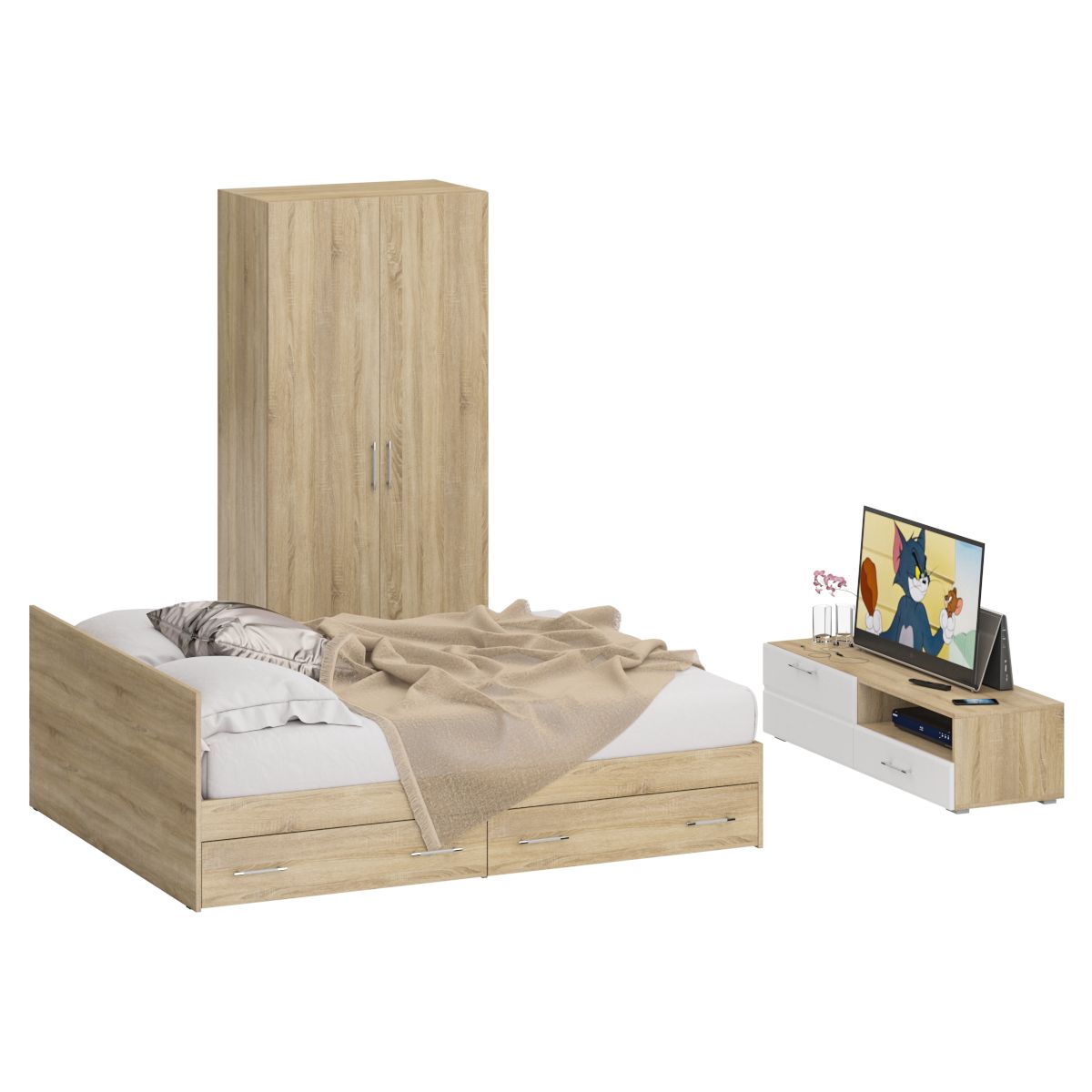 Спальня Стандарт № 3 с кроватью 1600 с ящиками. Сп.м. 1600х2000 мм, основание в комплекте (настил ДСП), матрас приобретается отдельно. За распашными дверками шкафа для одежды расположены отделение со штангой и антресольной полкой с одной стороны, и нишей с тремя полками с другой. Тумба под ТВ разделена на два одинаковой ширины отделения. Слева расположена закрытая откидной дверкой ниша, справа – открытая ниша и выдвижной ящик.