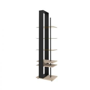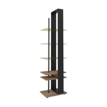 Изящный и стильный стеллаж с открытыми полками станет значимой интерьерной деталью гостиной. Комбинация стеклянных полок и элементов «под дерево» выглядит стильно и очень достойно. Благодаря невидимым глазу креплениям создается впечатление, что стеклянные полки висят в воздухе. Но несмотря на кажущуюся легкость и воздушность, тонированное стекло (серое) выдерживает нагрузку до 5 кг, что позволит разместить на стеллаже диски, комнатные растения или предметы декора. Регулируемые опоры слегка приподнимут стеллаж над полом, облегчая уборку, а также позволят компенсировать незначительные неровности пола.