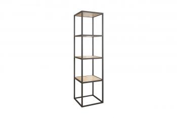 Стеллаж относится к категории узких и высоких моделей с деревянными полками. Металлический каркас придает изделию прочность, а ЛДСП-полки – теплоту и натуральность. Открытая конструкция без задней стенки делает стеллаж визуально легким и позволяет использовать его для зонирования пространства.