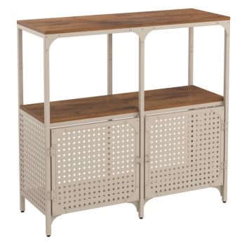 Открытый широкий стеллаж с распашными дверцами 42.35 Люмен дополнит интерьер гостиной, кабинета или загородного дома. Изделие с фасадами из перфорированного металлического листа в промышленном стиле Лофт с ноткой винтажного шарма. Корпус: ЛДСП и металл. Фасад : металл. Ручки: металл. Опоры: металл.