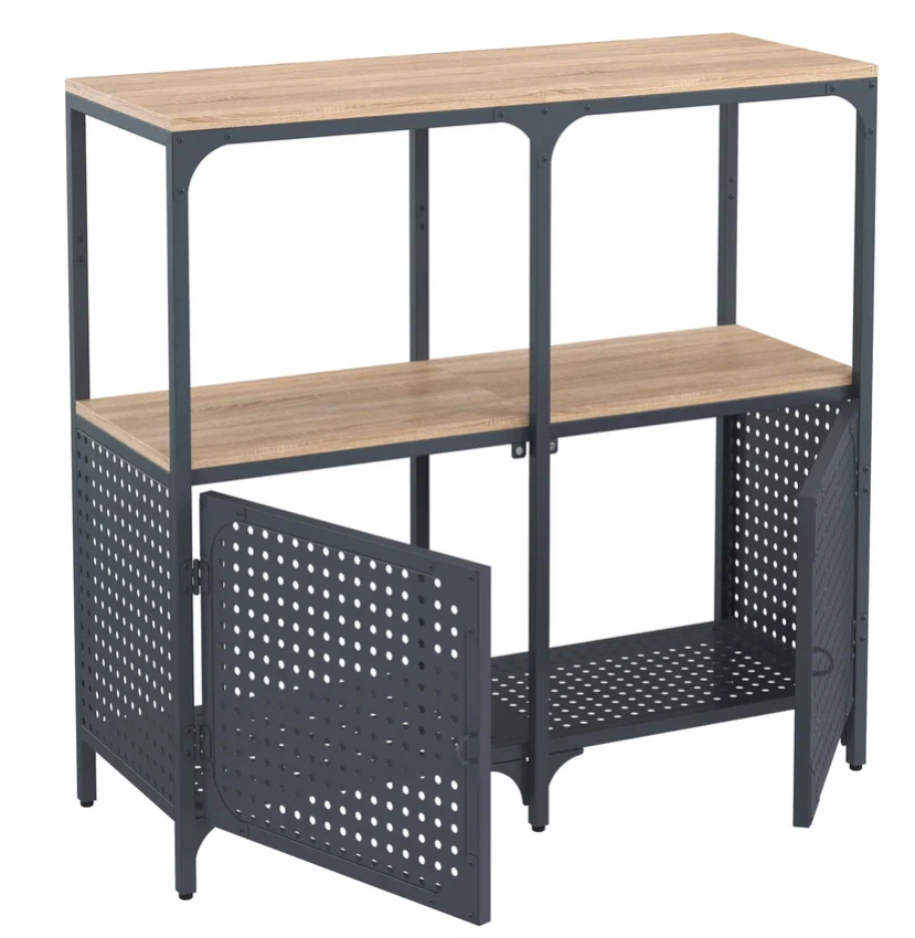 Открытый широкий стеллаж с распашными дверцами 42.35 Люмен дополнит интерьер гостиной, кабинета или загородного дома. Изделие с фасадами из перфорированного металлического листа в промышленном стиле Лофт с ноткой винтажного шарма. Корпус: ЛДСП и металл. Фасад : металл. Ручки: металл. Опоры: металл.