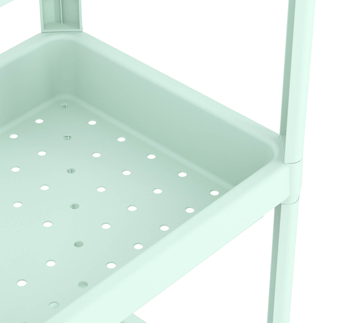 Стеллаж выполнен из полипропилена с армирующими добавками, что обеспечивает высокую жесткость и надежность конструкции. Благодаря этому, каждая полка выдерживает 7кг. Изделие устойчиво к ударам, воздействиям окружающей среды, не боится воды, влаги и солнечных лучей, поэтому этажерку можно использовать в любых условиях.