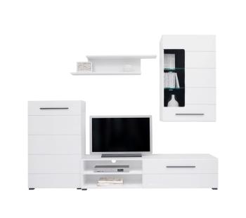 Стенка состоит из шкафа, тумбы под телевизор, подвесной витрины и полки.