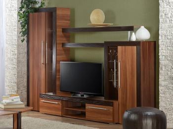 Стильная и современная стенка Джордан 6-559 выполнена цвете слива валлис/венге. Стенка состоит из двух шкафов, тумбы ТВ, межсекционных полок.