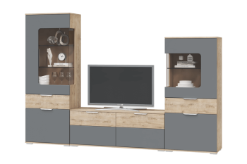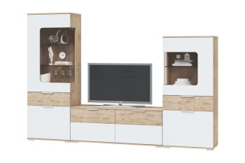 Ищите мебель для гостиной в современном стиле? Коллекция Вегас – отличное решение! Стенка состоит из двух функциональных шкафов-витрин и тумбы под телевизор. Сочетание приятного декора с древесной структурой у корпуса и белоснежных фасадов визуально освежат помещение, а комбинированные стеклом дверцы облегчат интерьер. Кроме визуальной привлекательности, мебель достаточно вместительна. Вы с легкостью обустроите ТВ-зону и сможете расположить разноплановые вещи: книги, сервиз, домашнюю утварь и предметы декора.