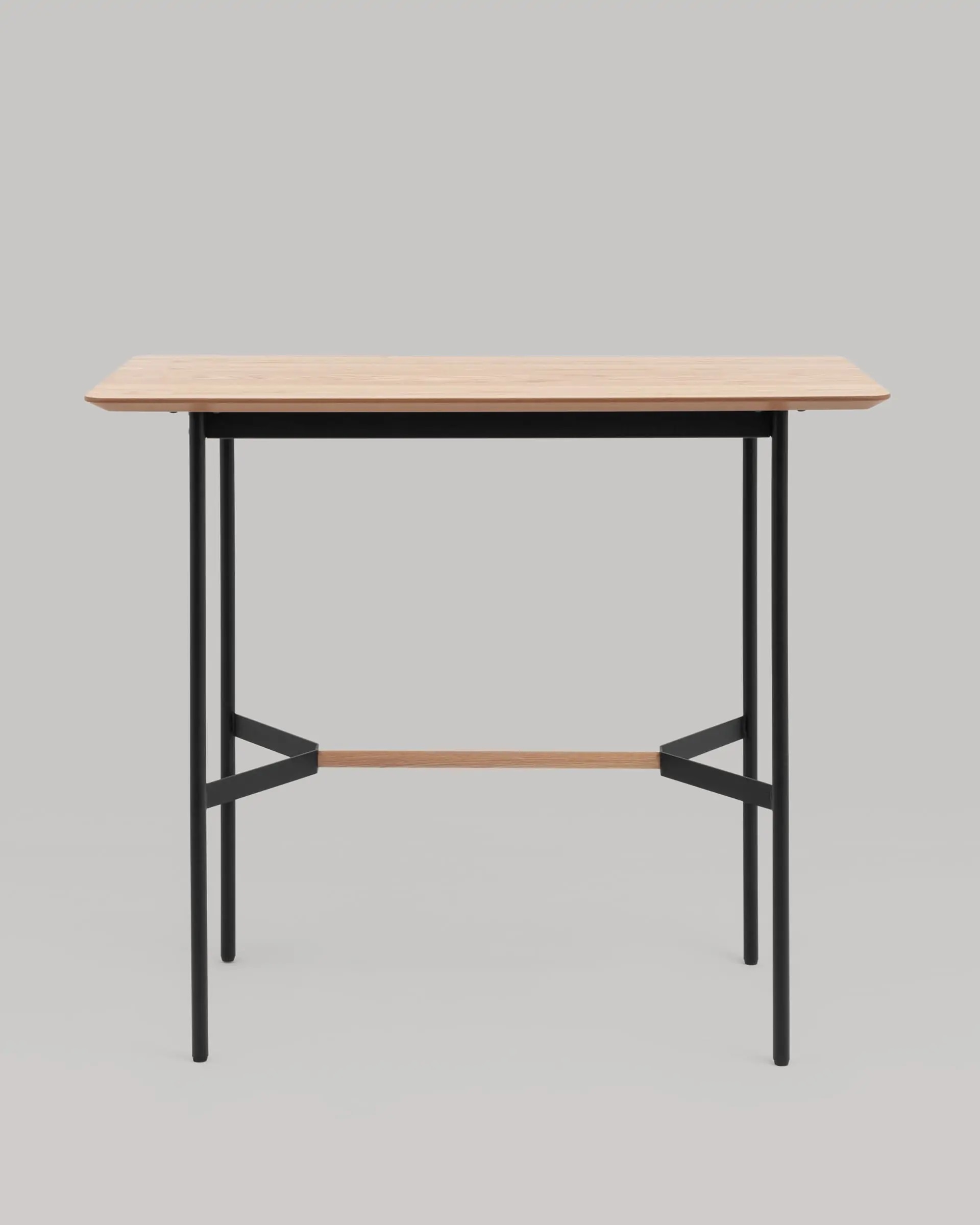 Прямоугольная столешница 120*60 см выполнена из МДФ с покрытием из шпона. Каркас и ножки стола изготовлены из металла в тон столешнице, центральная перекладина – из массива дерева.