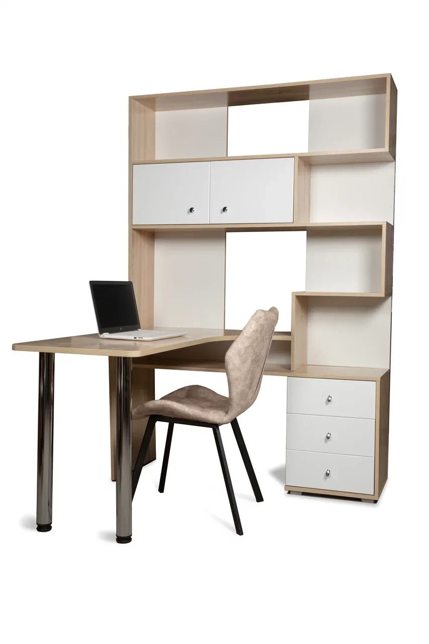 Компьютерный стол СК-10 отличается большой рабочей поверхностью, есть три вместительных ящика, просторные открытые полки над столом для бумаг, книг и всегда нужных мелочей, и закрытые полки для документов.