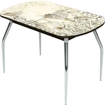 Кухонный стол ДМФ Аврора Ривьера мини 90×60 с оригинальной стеклянной столешницей, украшенной фотопечатью текстуры №33 и вставкой «бабочка», станет идеальным решением для вашего интерьера. Столешница выполнена из закаленного стекла, что придает изделию современный и стильный вид.