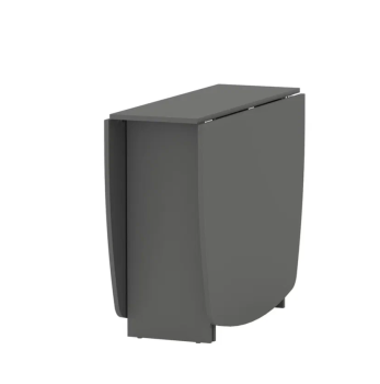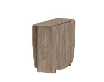 Стол изготовлен из ЛДСП толщиной 16 мм. Все видимые торцы обработаны кромкой ПВХ. Столешница прямоугольной формы, состоит из двух секций: две боковые – складные. Откидные части столешницы крепятся на металлических петлях. Стол установлен на пластиковые подпятники.