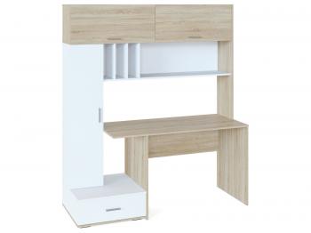 Над столешницей расположена надстройка с полочками, а также двумя закрытыми отделениями, дверцы которых поднимаются при помощи газлифтов. К надстройке примыкает стеллаж с распашной дверцей, за которой скрыты 3 полки. Под столешницей расположена ниша под системный блок, а также выдвижной ящик на шариковых направляющих.