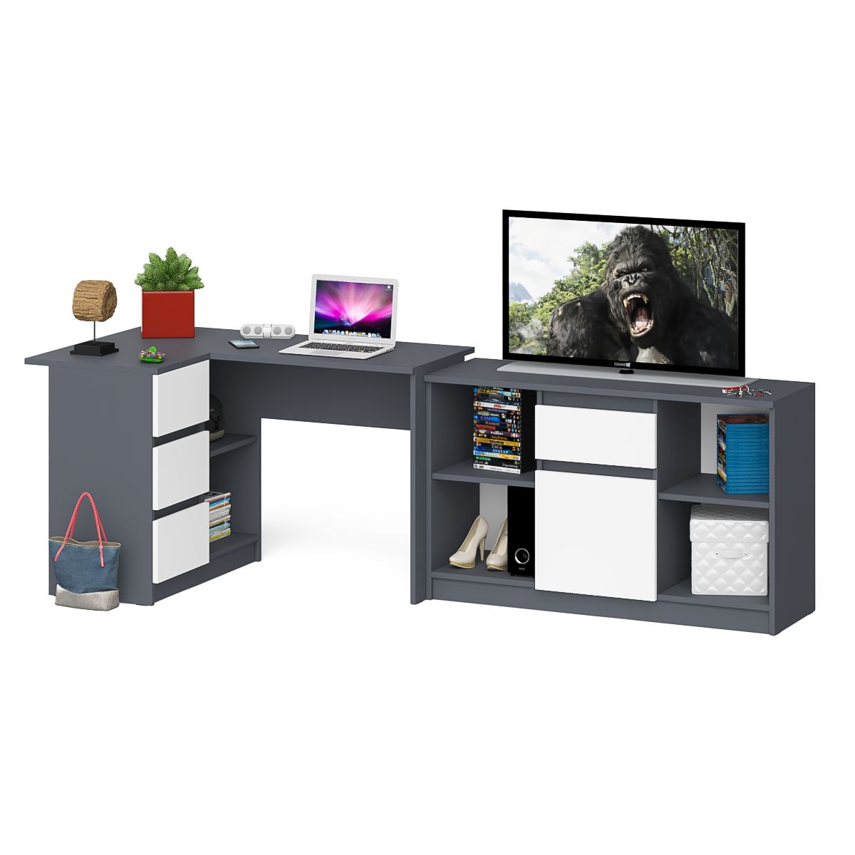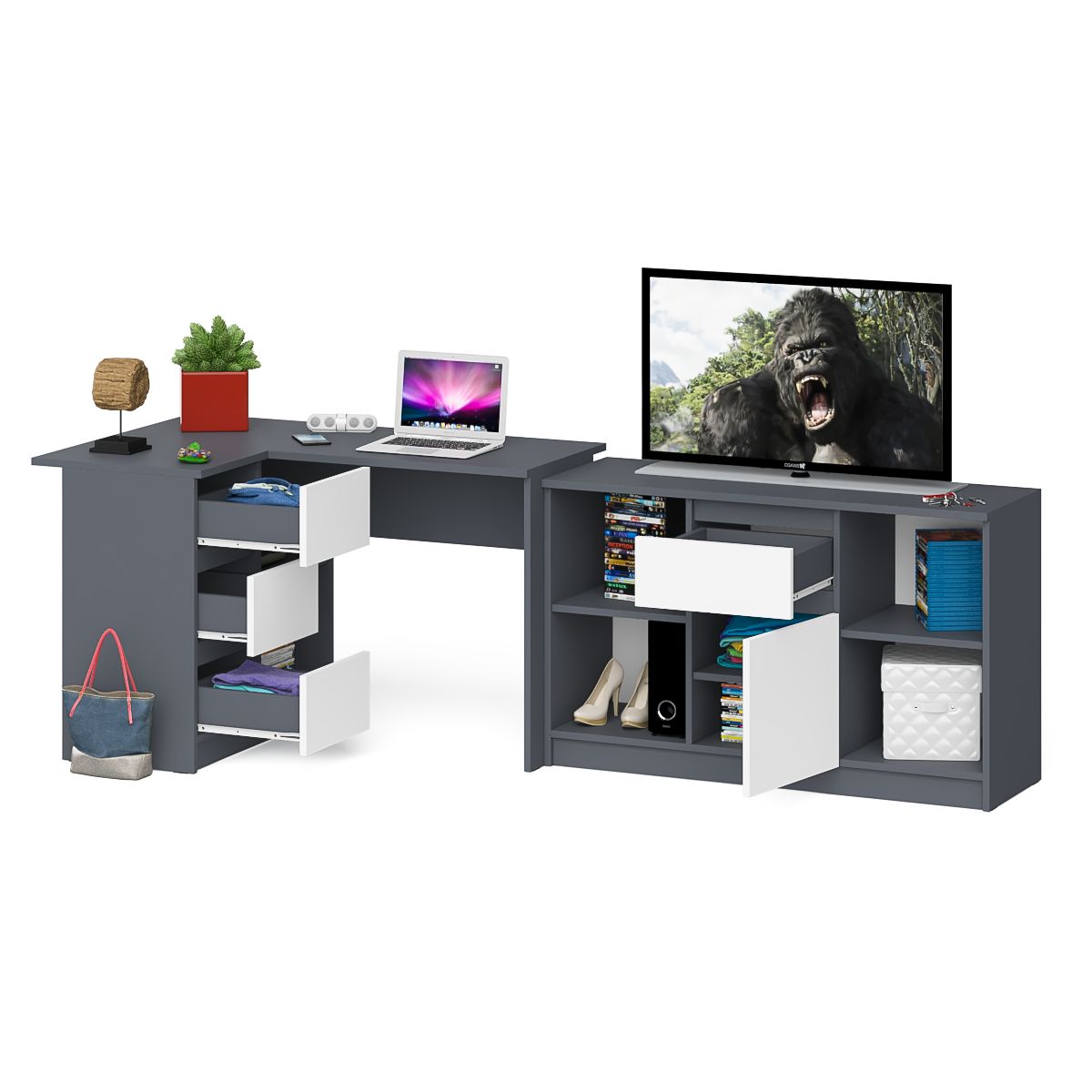 Тумба Мори МТВ1204.1 и стол компьютерный угловой МС-16 левый. Габариты (ШхГхВ) 244,8х84,9х76,6 см. Выдвижные ящики слева. Не универсальная сборка. Отсутствие ручек главное преимущество данной модели. Роль ручек выполняют сами фасады. Угловой компьютерный стол МС-16 левый. Тумба имеет 3 выдвижных ящика и нишу с полкой по середине.Тумба ТВ МТВ1204.1 состоит из двух открытых ниш по бокам и ящика и закрытой нишей по центру.