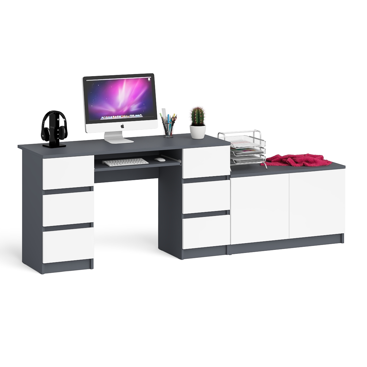 Двухтумбовый компьютерный стол Мори МС-2 с широкой тумбой на 900. Цвет – графит. Габариты (ШхГхВ) 225,8х50,4х76,6 см. Универсальная сборка. Стол оборудован 6 ящиками, под столешницей по бокам расположены две тумбы с тремя выдвижными ящиками в каждой. За распашными дверкми тумбы Мори МА900.1 расположена полка по центру.