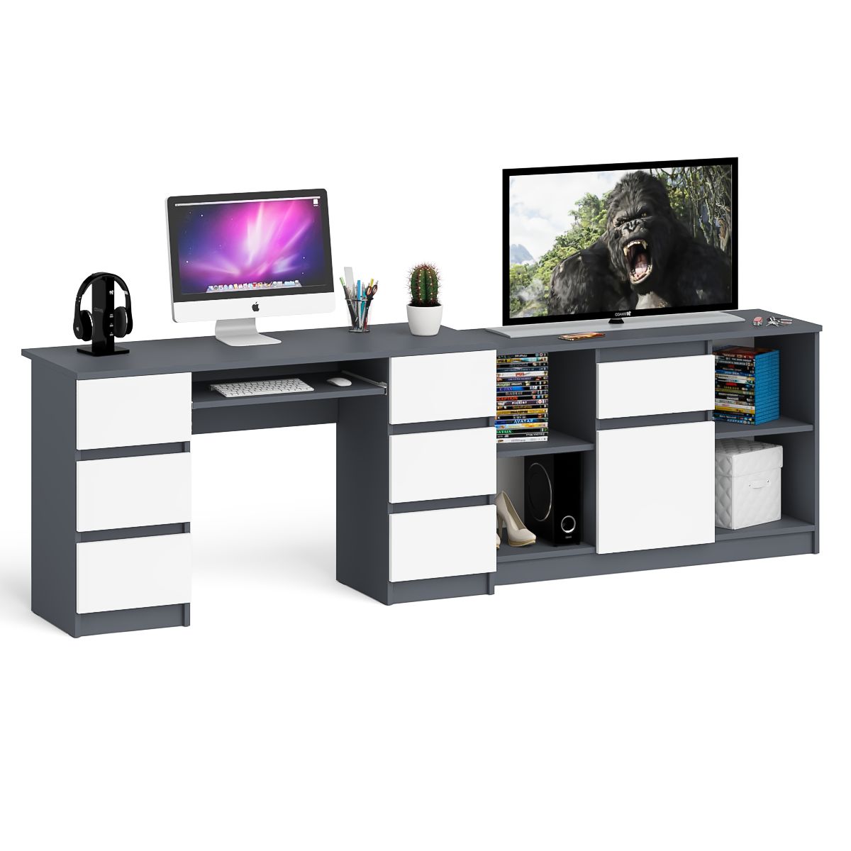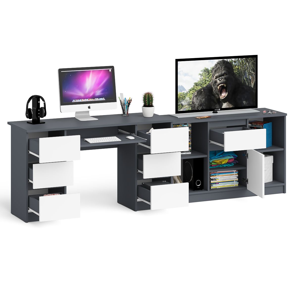Тумба Мори 1204.1 и стол компьютерный Мори МС-2. Габариты (ШхГхВ) 255,8х50х76,6 см. Универсальная сборка. Отсутствие ручек главное преимущество данной модели. Роль ручек выполняют сами фасады. Компьютерный стол с двумя тумбами МС-2 оборудован 6 ящиками и выдвижной полкой для клавиатуры. Тумба ТВ МТВ1204.1 состоит из двух открытых ниш по бокам и ящика и закрытой нишей по центру.