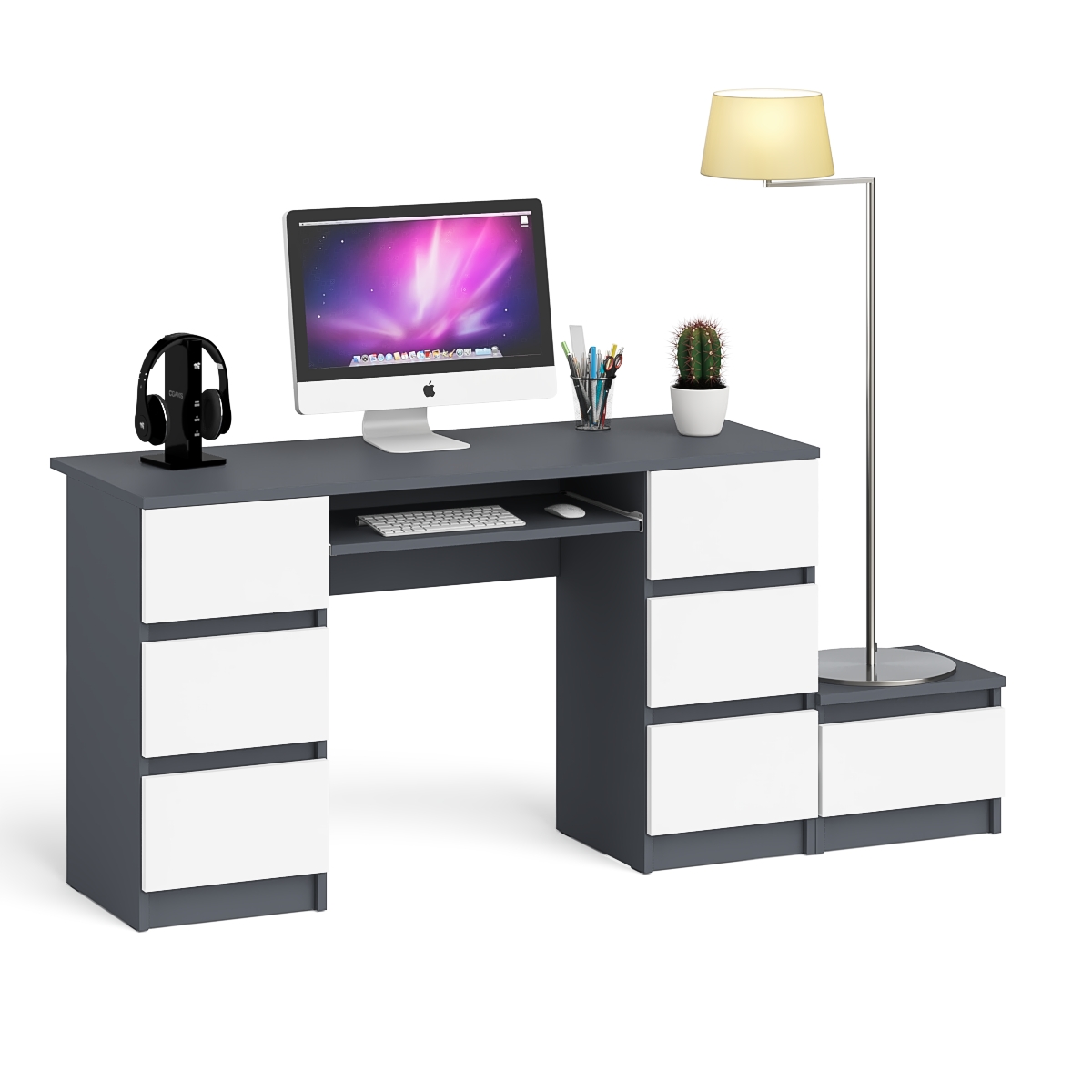 Компьютерный двухтумбовый стол Мори с дополнительной тумбой. Цвет – графит/белый. Габариты (ШхГхВ) 175,8х50х76,6 см. Универсальная сборка. Стол оборудован 6 ящиками, под столешницей по бокам расположены две тумбы с тремя выдвижными ящиками в каждой. Классическая тумба прикроватная с одним выдвижным ящиком. Можно использовать и как отдельный элемент.