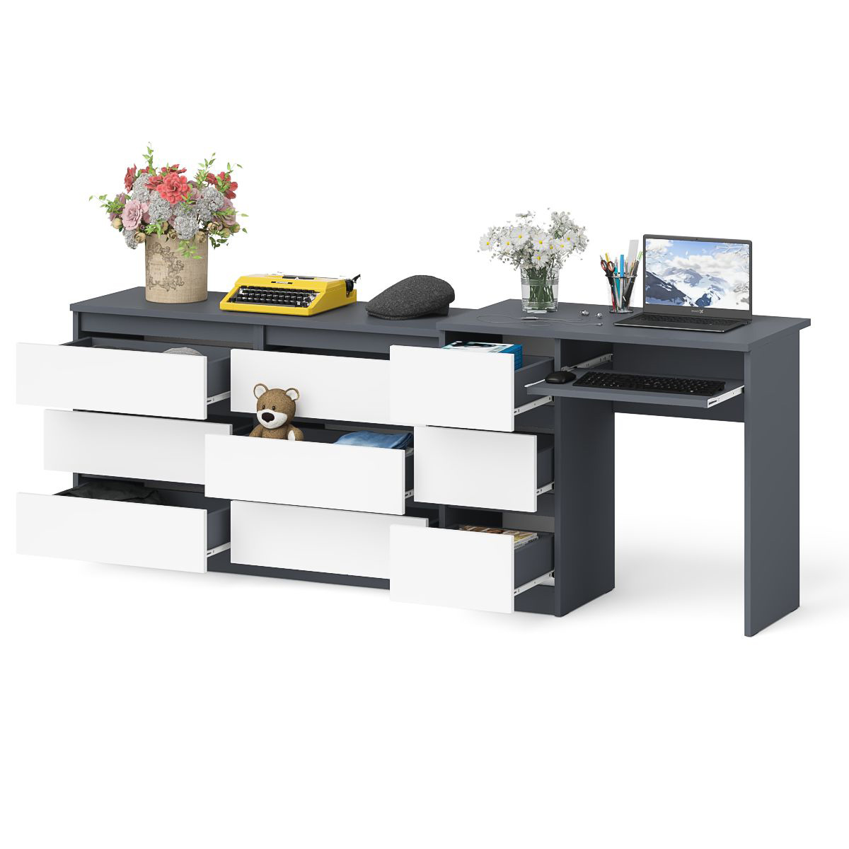 Комод Мори МК1200 6-ть ящиков со столом компьютерным МС-6 левым. Габариты (ШхГхВ) 210,4х50х76,6 см. Выдвижные ящики слева. Не универсальная сборка. Отсутствие ручек главное преимущество данной модели. Роль ручек выполняют сами фасады. Стол МС-6 левый компьютерный с тумбой и выдвижной панелью для клавиатуры. Широкий комод МК1200.6 оборудован шестью выдвижными ящиками, расположеными по три в два ряда.