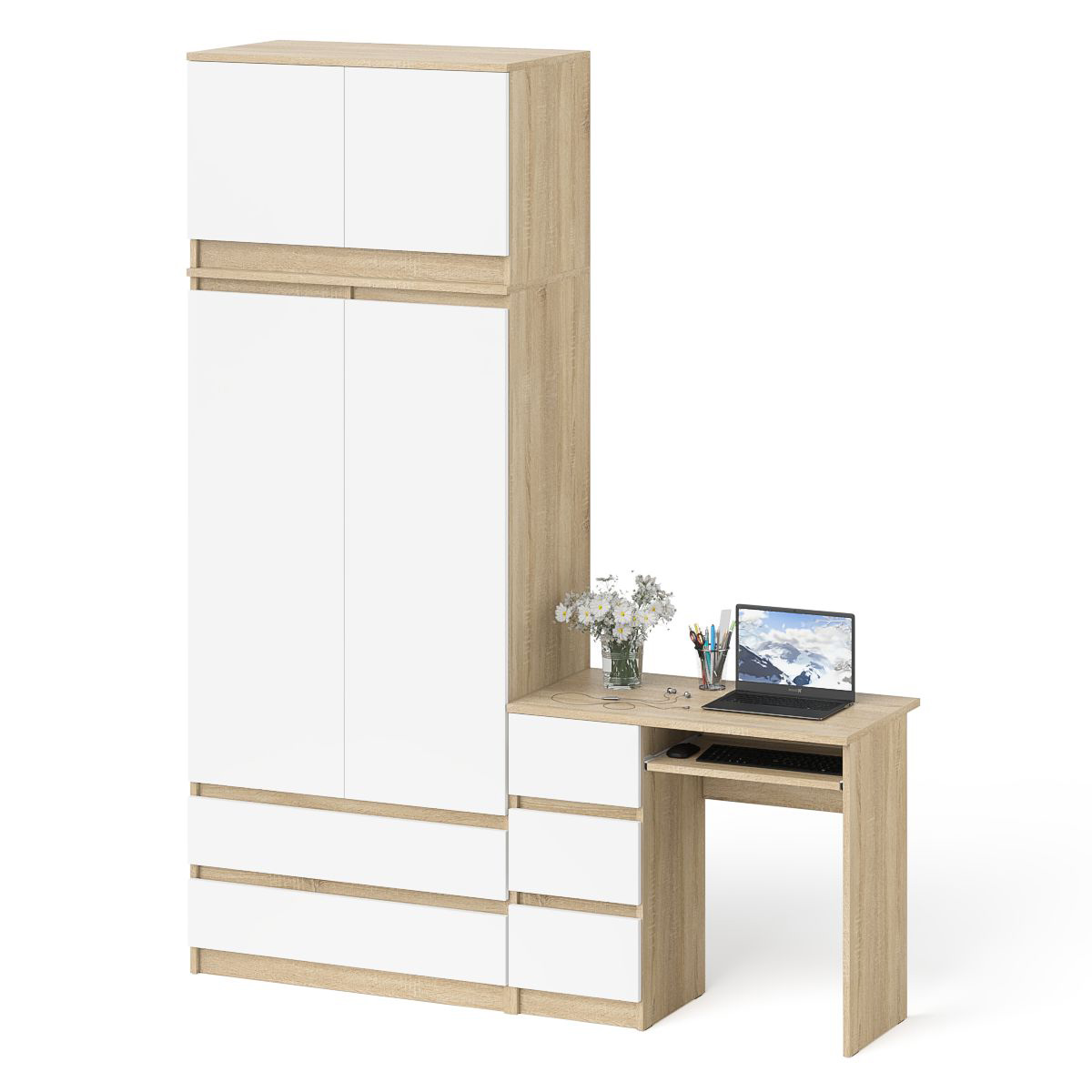 Однотумбовый стол компьютерный МС-6 левый с шкаф-комодом 900 с антресолью Мори. Габариты (ШхГхВ) 180,4х50,4х234,2 см. Выдвижные ящики слева. Не универсальная сборка. Отсутствие ручек главное преимущество данной модели. Стол МС-6 левый компьютерный с тумбой и выдвижной панелью для клавиатуры. Шкаф-комод оборудован двумя распашными дверями сверху и двумя выдвижными ящиками снизу. За распашными дверками антресоли МА900.1 расположена полка по центру.