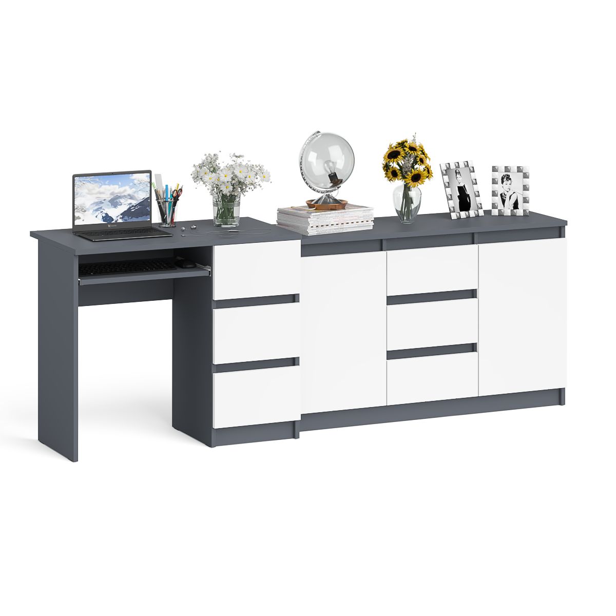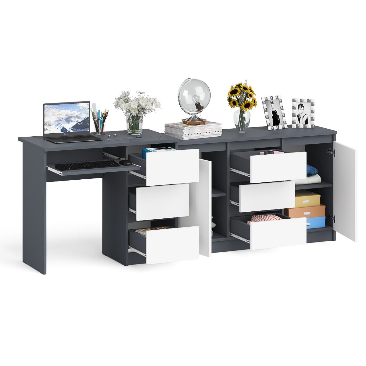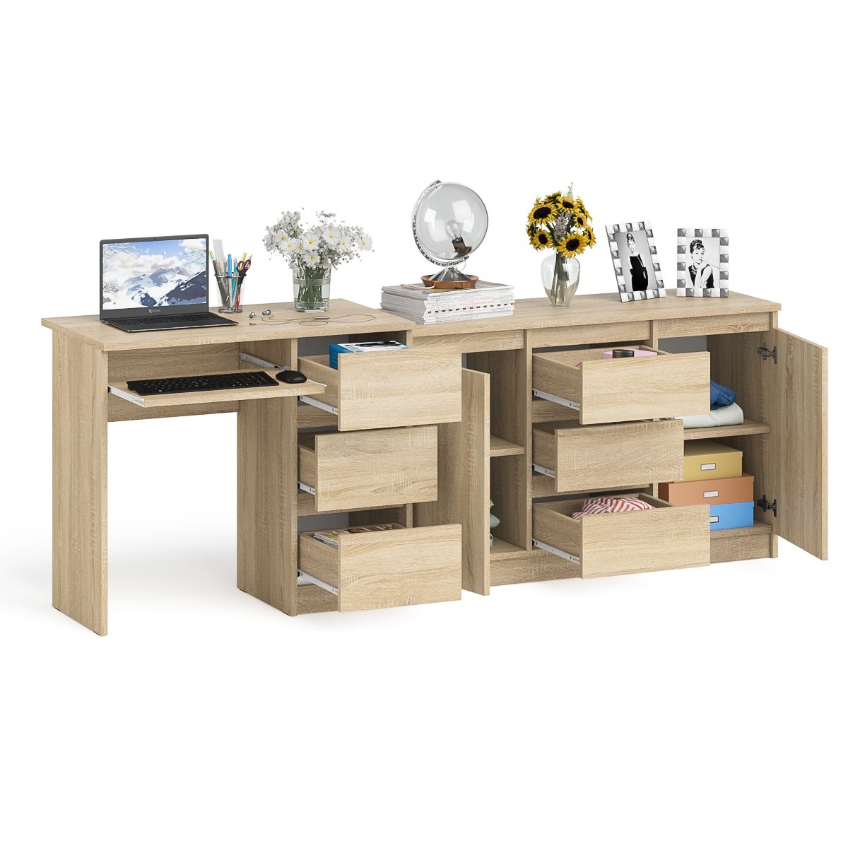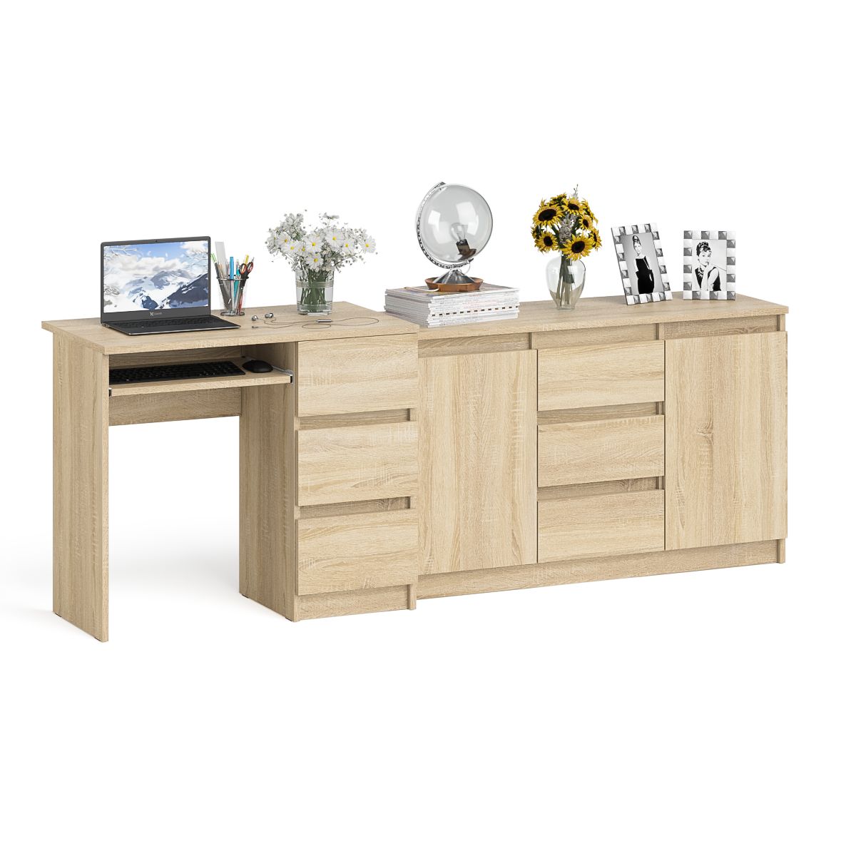 Тумба-комод МК1200 3 ящика и дверки и Мори компьютерный стол МС-6 три ящика справа. Габариты (ШхГхВ) 210,4х50х76,6 см. Выдвижные ящики справа. Не универсальная сборка. Отсутствие ручек главное преимущество данной модели. Стол МС-6 компьютерный правый с тумбой и выдвижной панелью для клавиатуры. Комод-тумба МК1200.3 оборудована по центру тремя выдвижными ящиками и двумя закрытыми отделениями с полками по бокам.