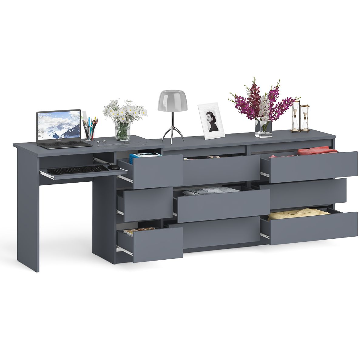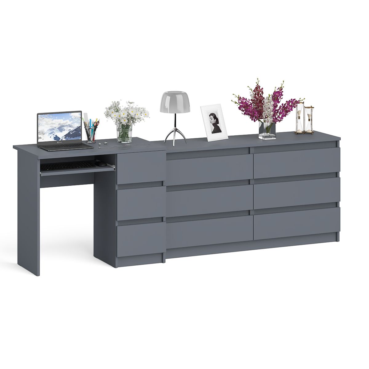 Комод 1380 6-ть ящиков Мори с однотумбовым столом компьютерным МС-6 правым. Габариты (ШхГхВ) 228х50х76,6 см. Выдвижные ящики справа. Не универсальная сборка. Стол МС-6 компьютерный правый с тумбой и выдвижной панелью для клавиатуры. Широкий комод МК1380.6 оборудован 6 ящиками, расположеными по три в два ряда.