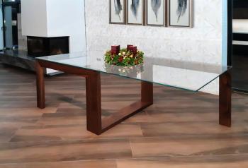 Обеденный стол из проекта “INVENTALL”. Массив ясеня, тонированное масло. Столешница – каленое стекло 8 мм.