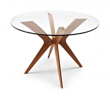 Небольшой обеденный столик из массива ясеня. Столешница из каленого стекла 8 мм. Финиш – тонировка, масло. Оригинальные гнуто-клееные элементы.