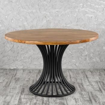 Прекрасный вариант круглого стола удивляет своей оригинальностью. Столешница изготовлена из благородного дерева акации, поэтому отличается своей прочностью и износостойкостью. Она имеет плавные очертания, интересные рельефы, текстуру. Подстолье выполнено из нескольких металлических труб, искусно изогнутых с определенным радиусом, образующих одну центральную опору. Из тандема получается уникальная композиция. При желании столешницу можно заменять. В нашем интернет-магазине мы поможем вам подобрать интересные варианты. Экспериментируйте с удовольствием.